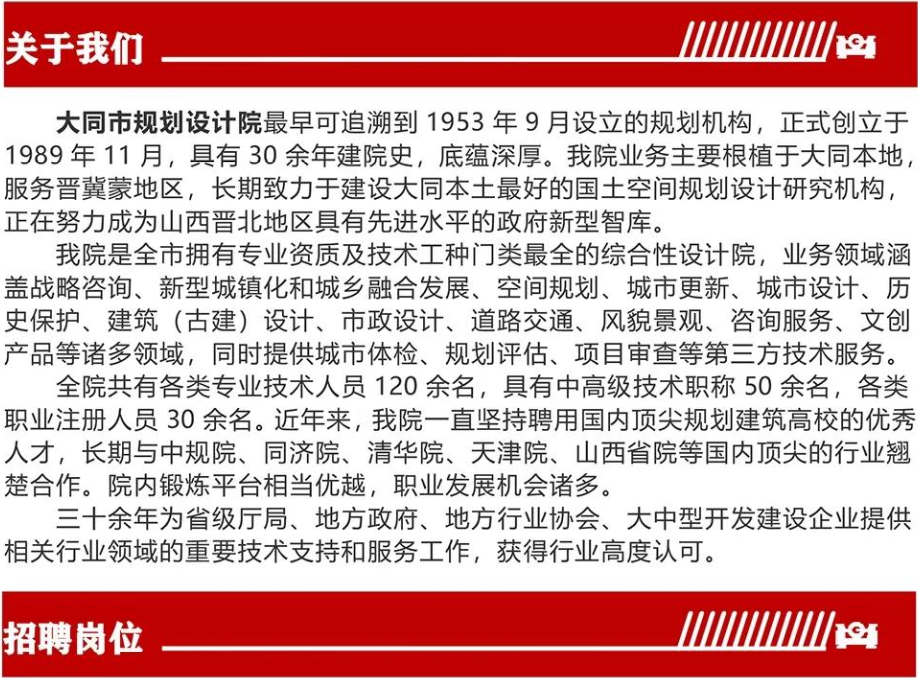 大同市規(guī)劃設計院,成立于1989 年11 月。是大同市城鄉(xiāng)規(guī)劃局下屬的全民事業(yè)單位,是以城市規(guī)劃為主體的具有城市規(guī)劃甲級資質(zhì),市政公用行業(yè)乙級資質(zhì),建筑工程設計乙級資質(zhì)、工程咨詢丙級資質(zhì)的綜合性設計院。